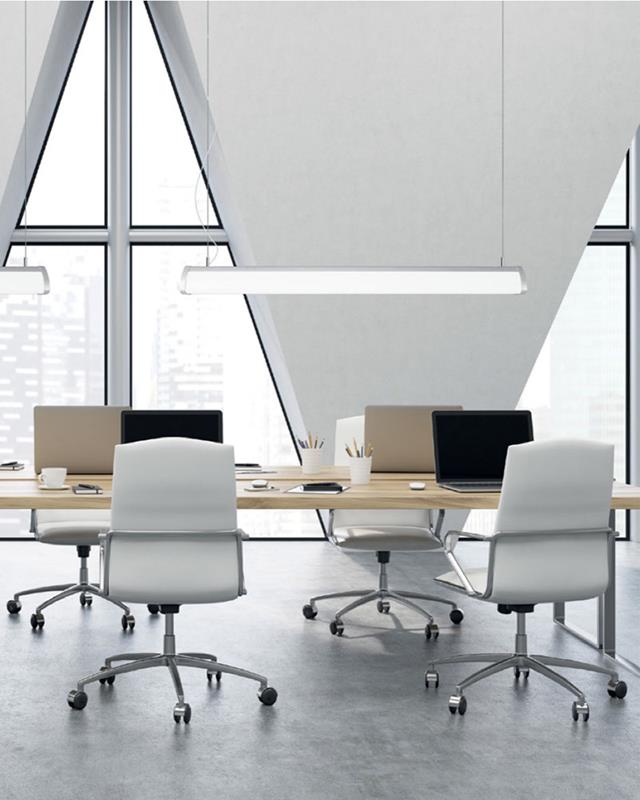 Lámpara suspendida fabricada en aluminio color gris con tapas de ABS y difusor opal. Iluminación directa e indirecta.