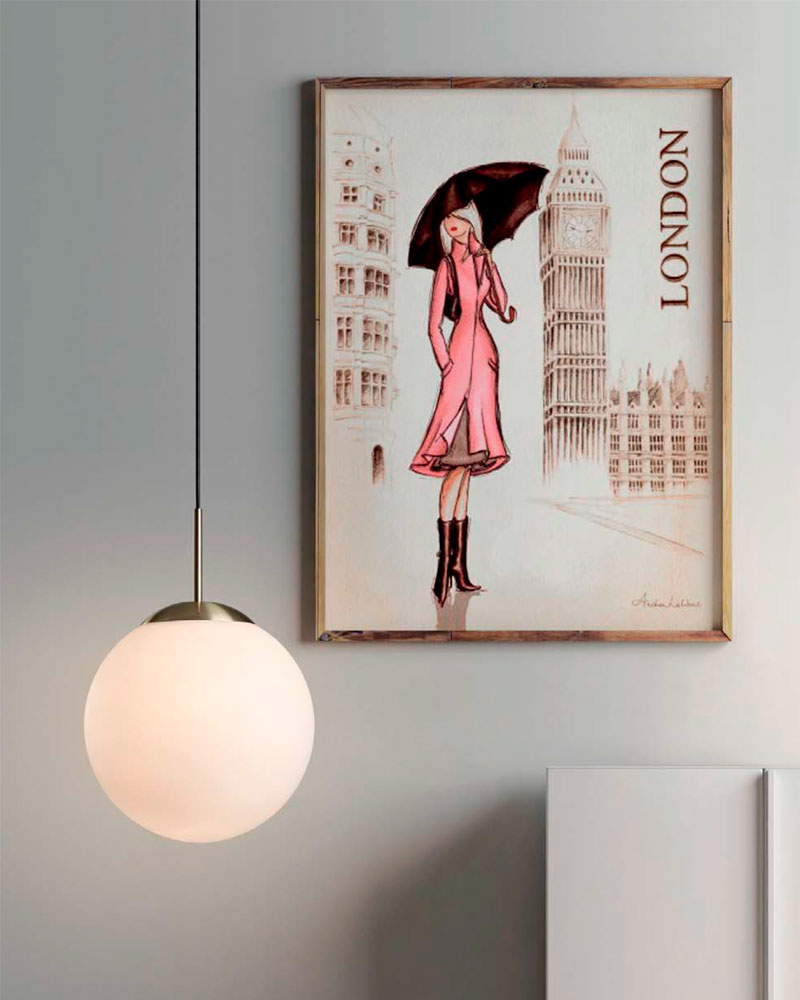 Lámpara de colgar de aspecto clásico compuesta de una esfera de 30cm en acabado blanco opal con soporte metálico disponible en diferentes acabados.