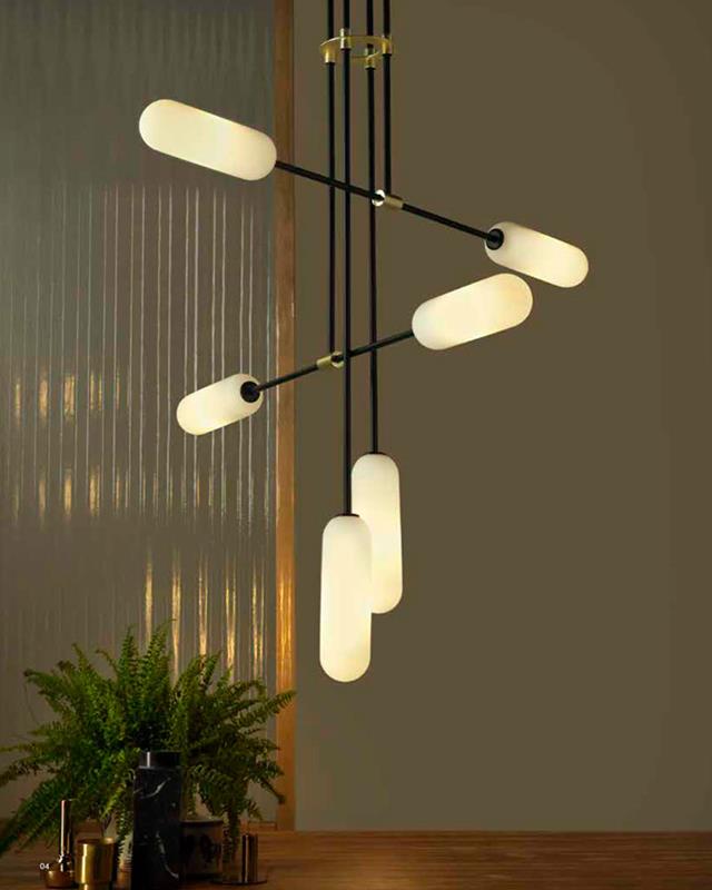 Lámpara de colgar decorativa para instalación en techo en color negro con 6 tulipas de cristal en acabado blanco opal.
