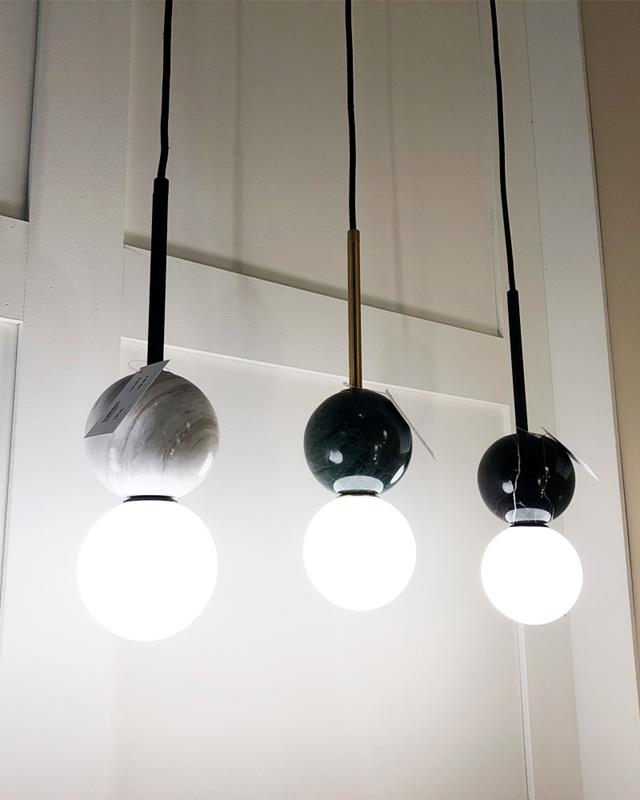 Lámpara de colgar decorativa en mármol en diferentes acabados con tulipa de cristal opal blanco con portalámparas G9 y bombilla LED.