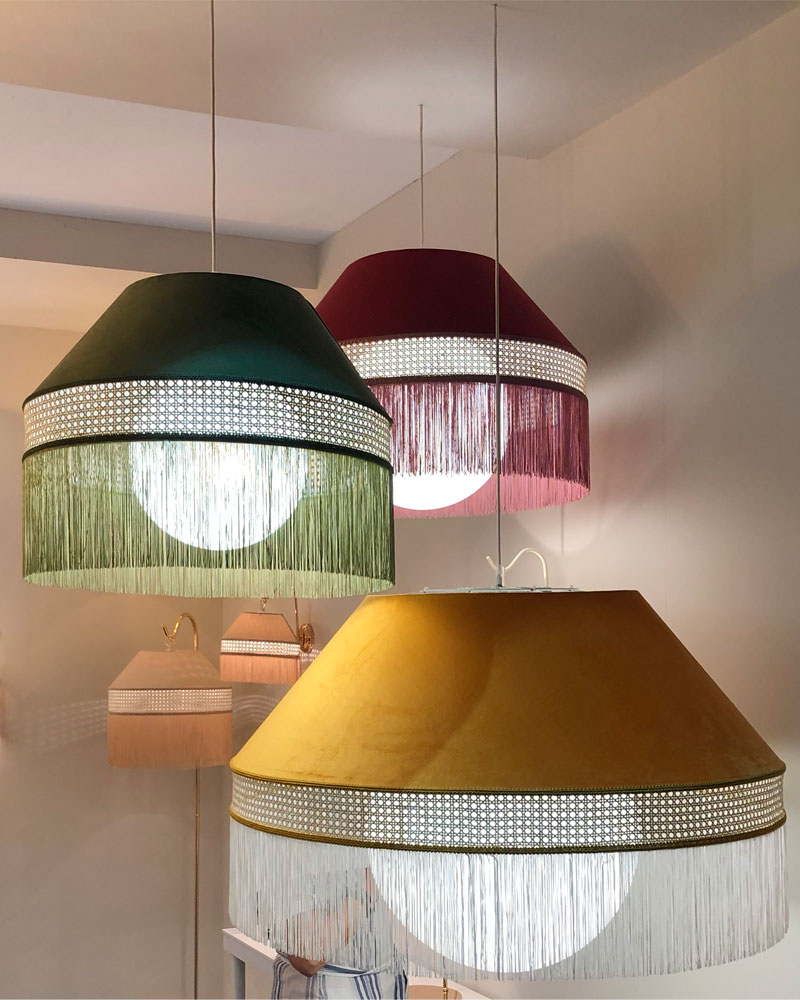 Lámpara de colgar fabricada en tela terciopelo en diferentes colores, flecos de hilo y Natán en acabado natural.