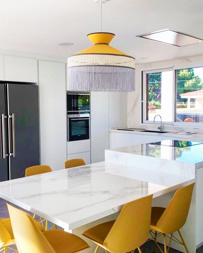 Lámpara de techo colgante fabricada en tela percalinas disponible en 12 colores con detalle en ratán en acabado natural y con flecos decorativos.