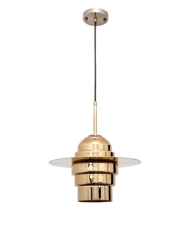 Lámpara colgante decorativa fabricada en metal en acabado color oro. Visera sobrepuesta removible circular.