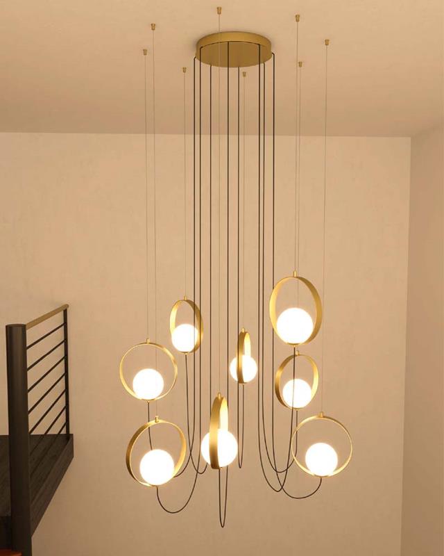 Lámpara colgante compuesta de varios brazos con lámparas en color oro y cristal opal