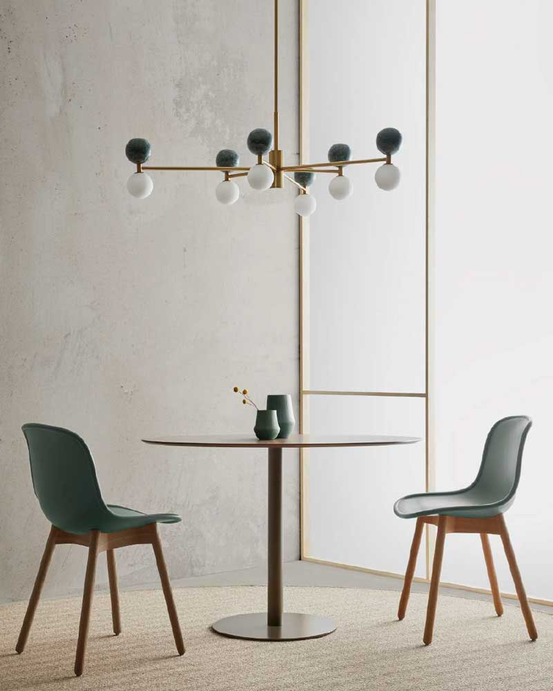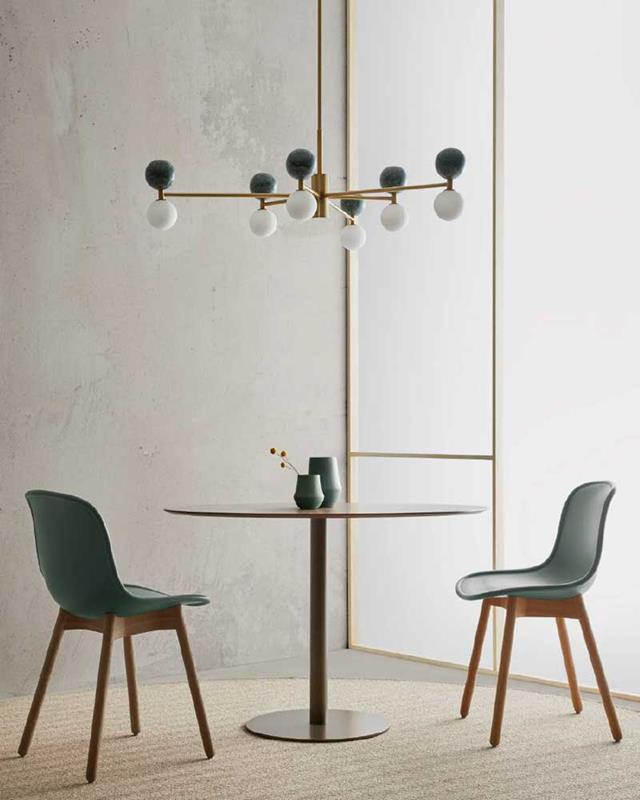 Lámpara de colgar fabricada en metal, mármol y cristal disponible en diferentes combinaciones de acabados a elegir.