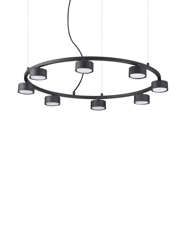 Lámpara de colgar decorativa de forma circular fabricada en metal disponible en 2 tamaños con diferentes configuraciones, versiones de 5 u 8 elementos luminosos.