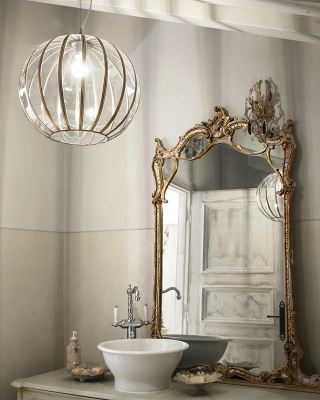 Lámpara de colgar en metal y cristal transparente en acabado oro envejecido.