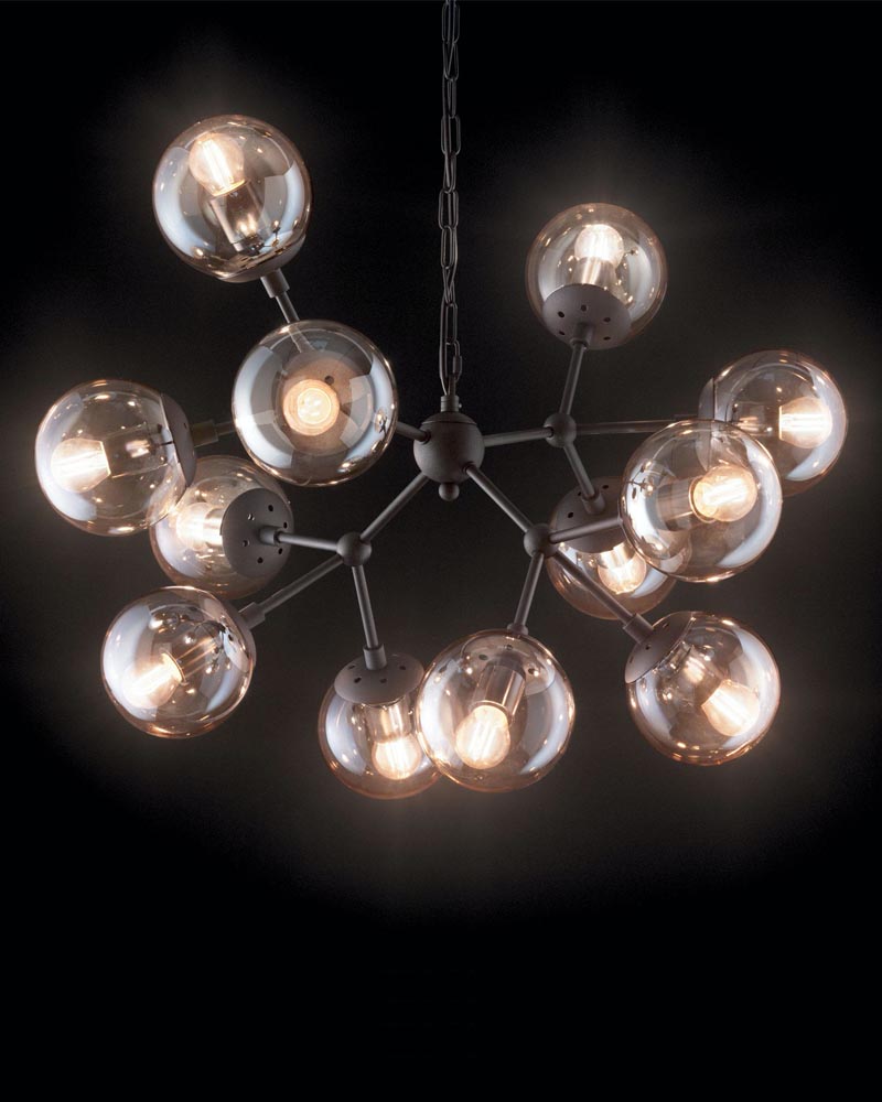 Lámpara de colgar decorativa disponible en 2 versiones, de 12 o 18 brazos con tulipas de cristal transparente en acabado ámbar.
