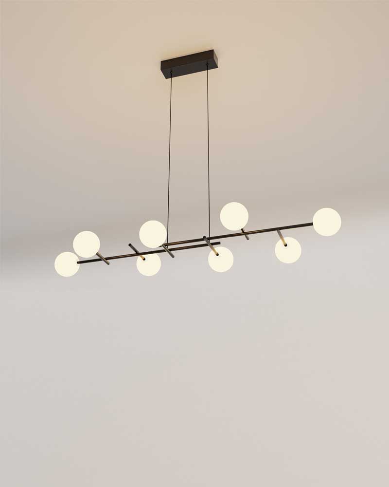 Lámpara de colgar fabricada en metal color negro con 8 tulipas esféricas de cristal opal
