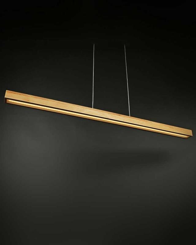 Lámpara de colgar lineal fabricada en madera natural con iluminación LED integrada. Detalles metálicos en acabado cromo.