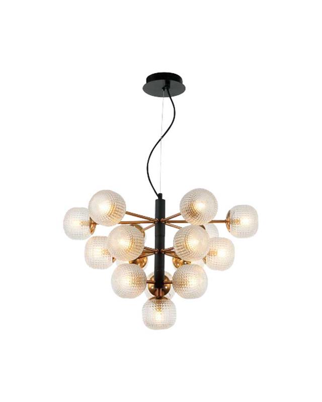 Lámpara de colgar de gran tamaño fabricada en metal en color negro y oro con 16 brazos con tulipas de cristal.