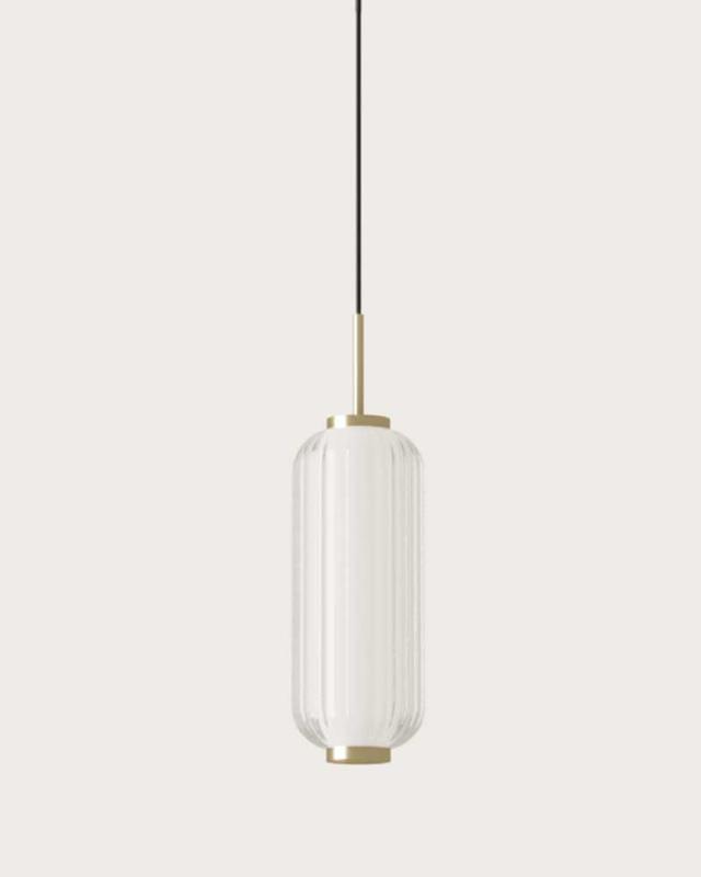 Lámpara de colgar co tulipa de cristal estriado con iluminación LED integrada en tono cálido regulable en intensidad.