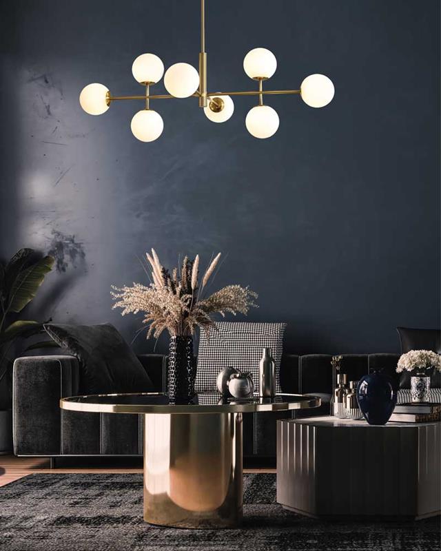Lámpara de colgar disponible en color oro o negro compuesta de 20 brazos con tulipa de cristal opal blanco