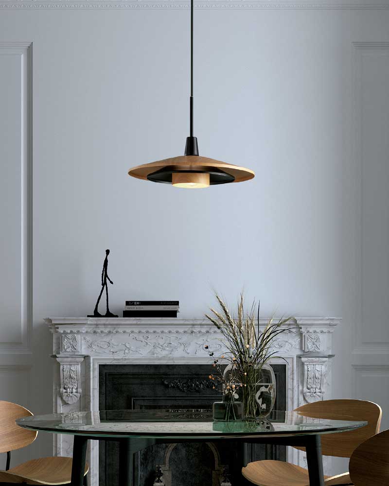 Lámpara de colgar fabricada en metal en acabado negro mate y madera natural.