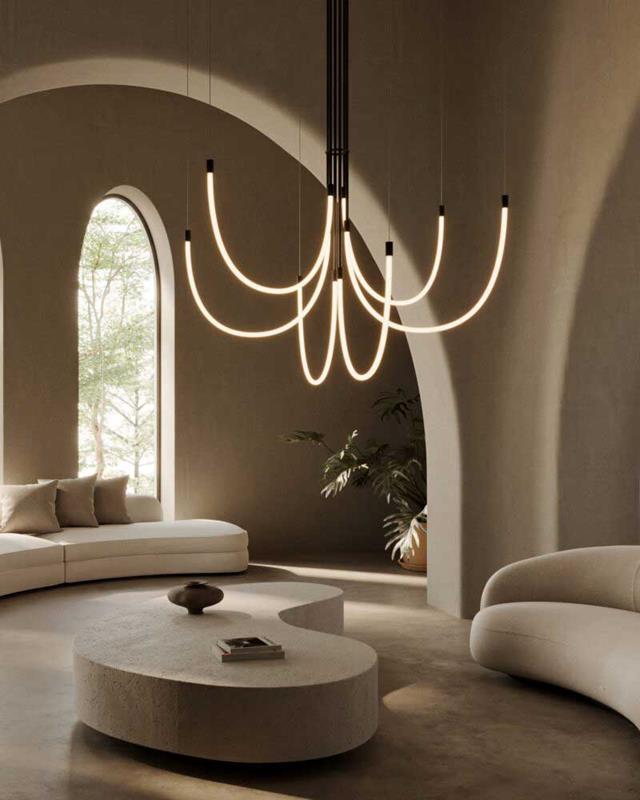 Lámpara de colgar fabricada en metal en diferentes acabados con 6 brazos con iluminación LED.