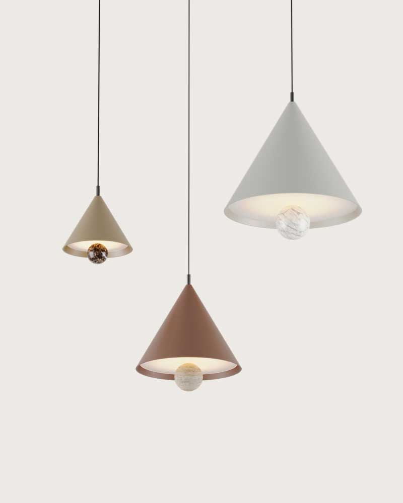 Lámpara de colgar fabricada en metal con detalle en mármol disponible en diferentes acabados y tamaños.