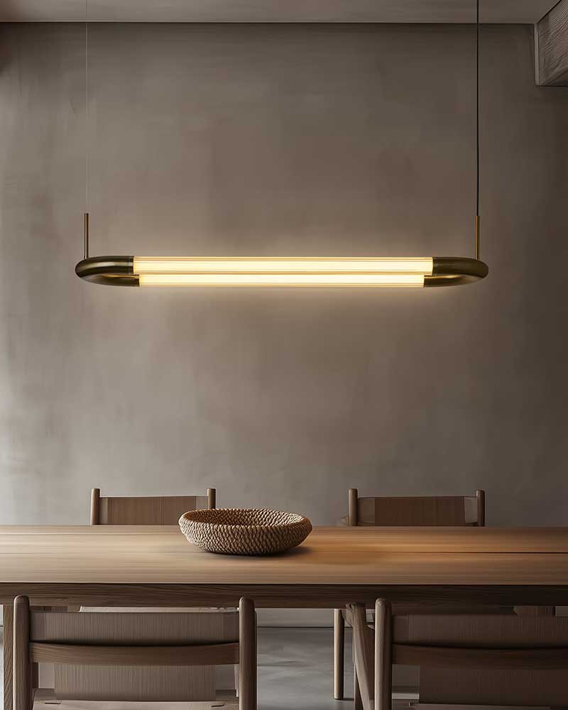 Lámpara de colgar fabricada en metal y cristal con iluminación LED regulable.