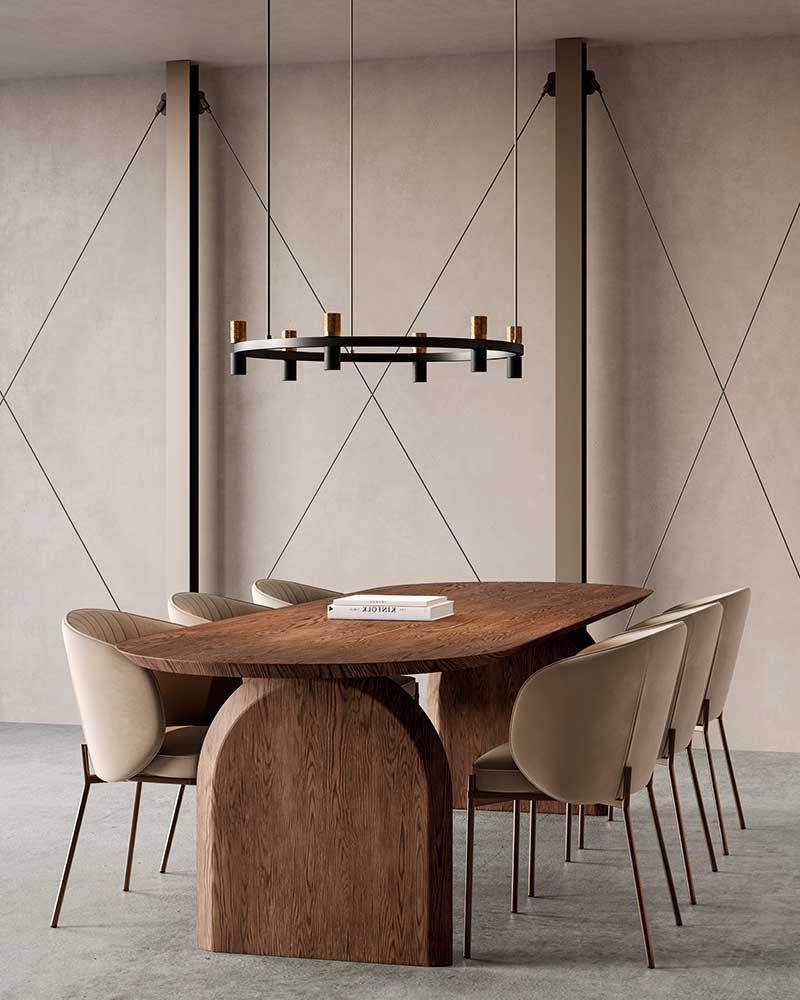 Lámpara de colgar fabricada en metal con detalles en cuero en diferentes acabados