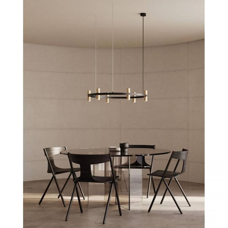Lámpara colgante compuesta de una estructura metálica con 12 focos LED con cabezales de cuero.