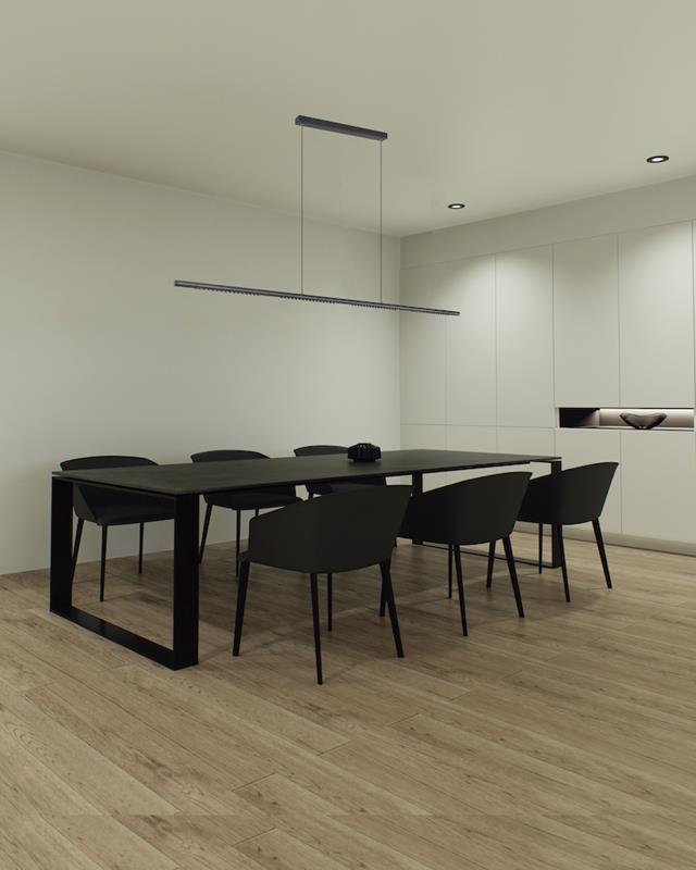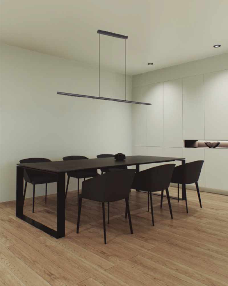 Lámpara de colgar lineal fabricada en aluminio en color blanco o negro con iluminación LED en tonalidad cálida o neutra y disponible en 2 tamaños.