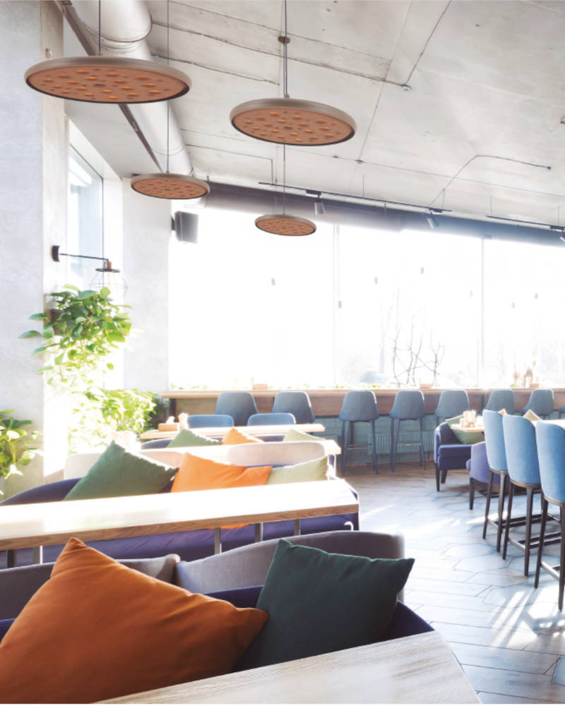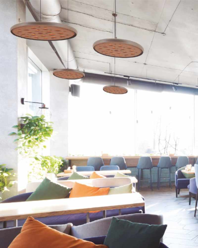 Lámpara de colgar fabricada en aluminio y material aislante acustico