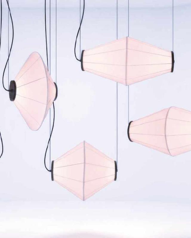 Lámpara de colgar fabricada en aluminio en color negro y tela en blanco con iluminación LED y 3 formas diferentes.