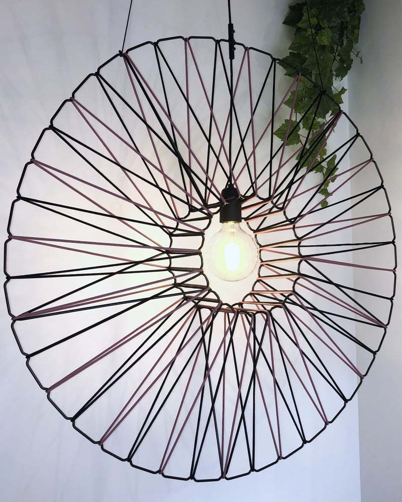Lámpara de colgar fabricada con estructura metálica en color negro recubierto de cuerda trenzada a mano en diferente gama de colores.