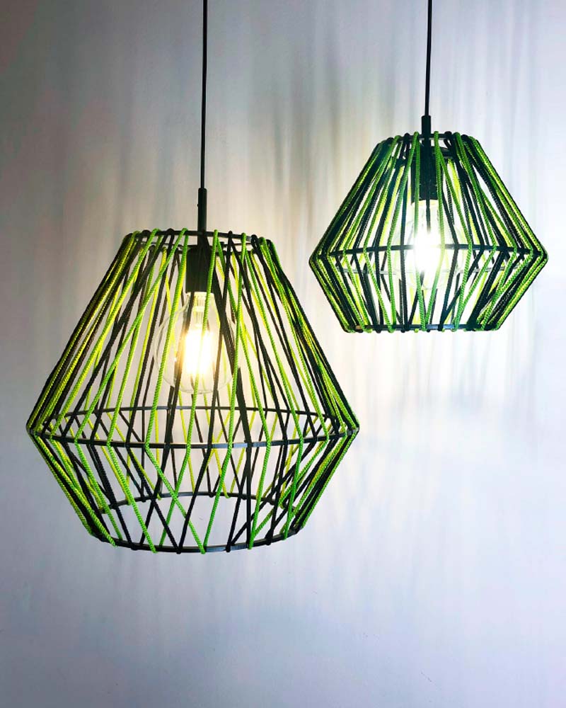 La lampara se fabrica a medida y se pueden elegir los colores de las cuerdas, con 1 solo color o combinando dos colores.