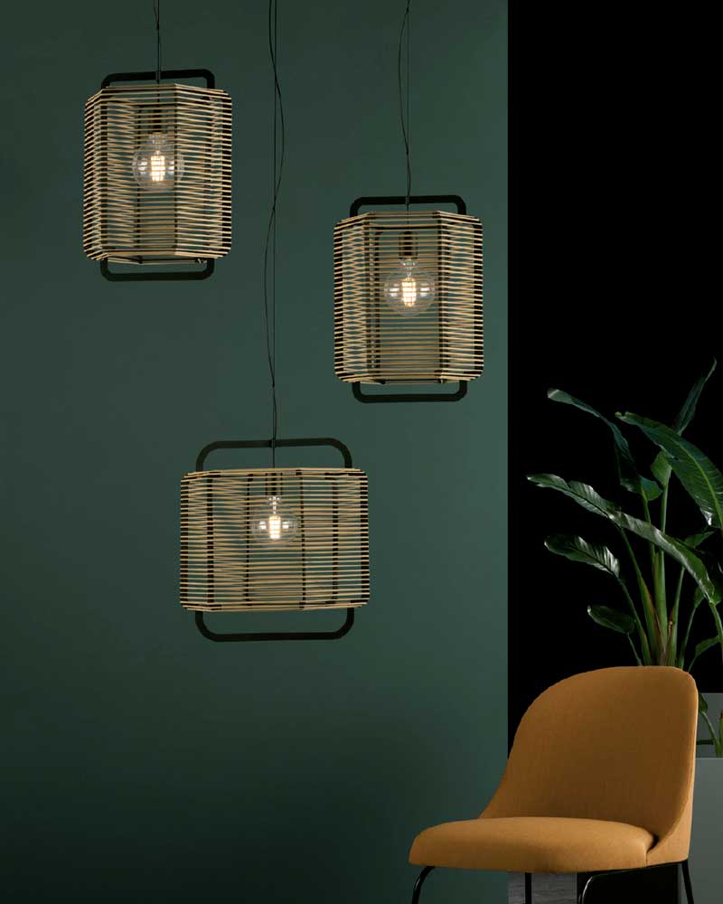 Lámpara de colgar de estructura metálica en color negro recubierta de cuerda trenzada en diferentes acabados.