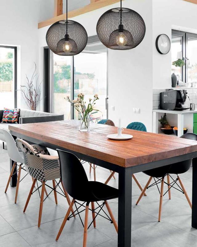 Lámpara de colgar fabricada en rejilla de metal en color negro.