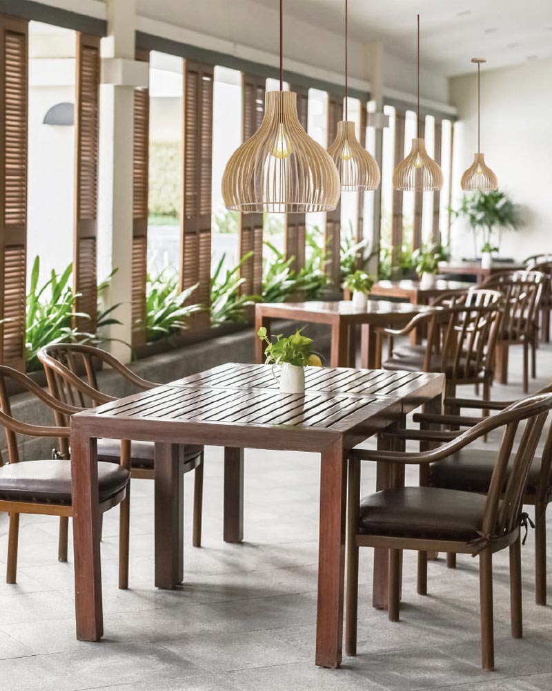 Lámpara colgante de madera en diferentes tamaños.