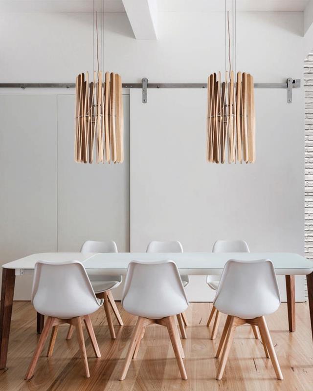 Lámpara de techo colgante compuesta de una tulipa de gran tamaño en madera.