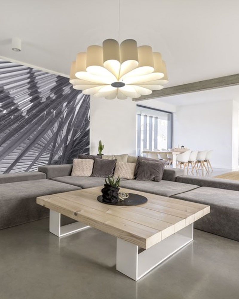 Lámpara de techo colgante compuesta de una tulipa de gran tamaño fabricada en gamas de madera de haya o con laminas de PVC.