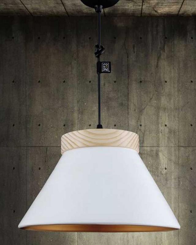 Lámpara de colgar compuesta de una tulipa fabricada en cerámica cocida a 900º disponible en diferentes acabados a elegir con una pieza en la parte superior de madera en acabado natural. Cable en color negro, portalámparas E-27 (Bombilla no incluida).