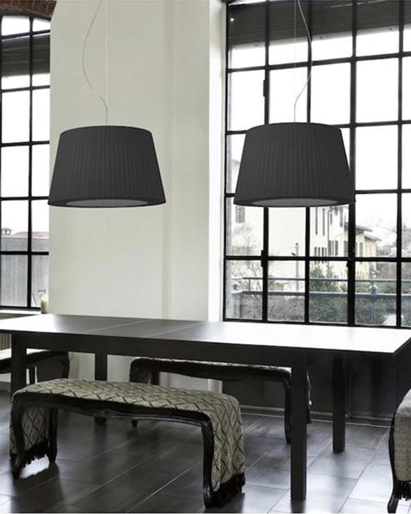 Lámpara de techo para montaje suspendido de gran tamaño compuesta de una tulipa de tela encintada disponible en diferentes acabados.Ideales para iluminar salones o como lamparas de comedor.