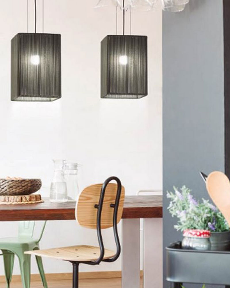 Lámpara de techo de formas rectas compuesta de una tulipa de cordón trenzado a mano en la fábrica de Valencia.