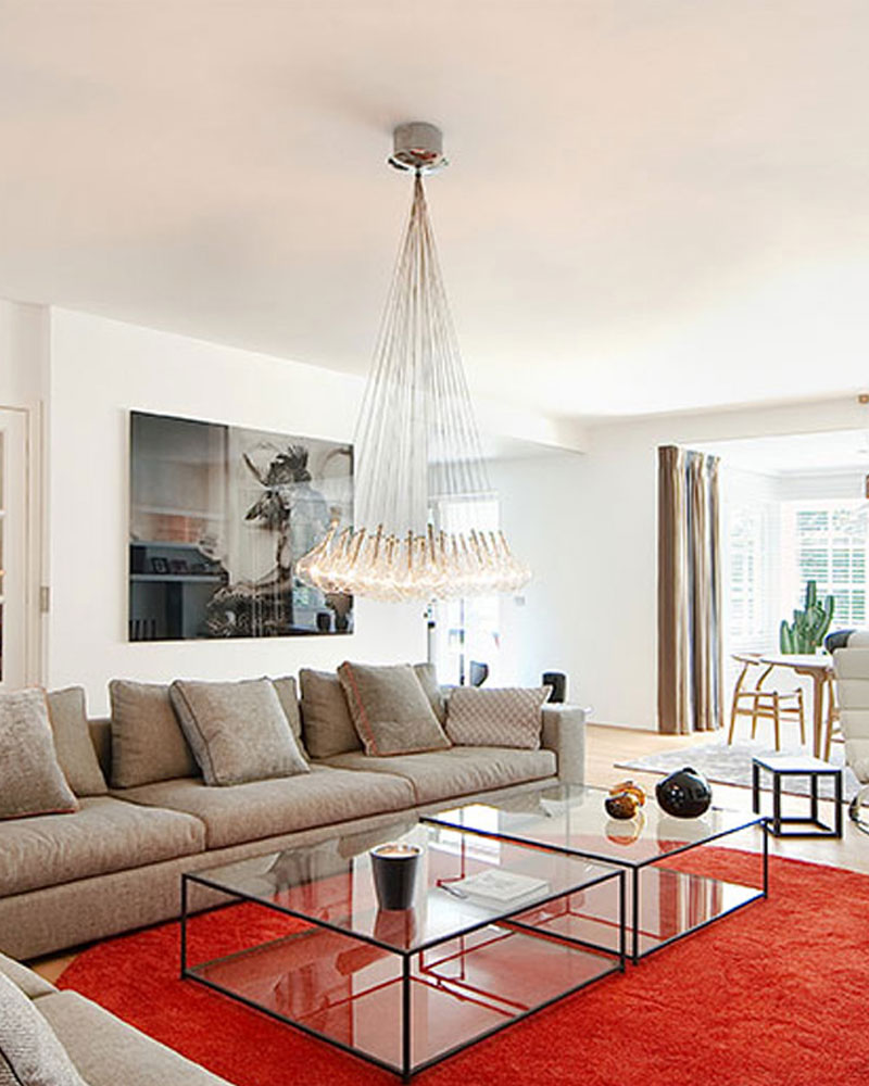 Lámpara de diseño fabricada en metal y cristal compuesta por 19 o 37 tulipas de cristal transparente en forma de gota. Cada tulipa incorpora un punto de luz con un casquillo G4 para la instalación de una bombilla de máximo 10w 12v de potencia. Incluye transformador regulable.