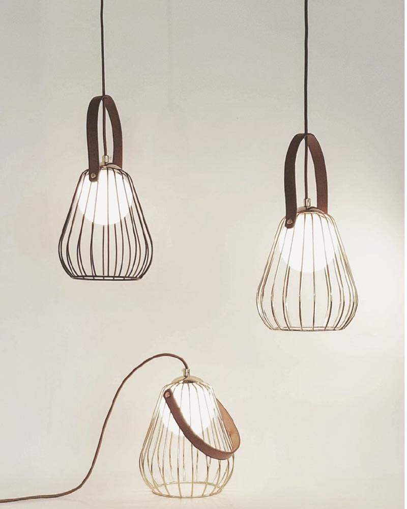 Lámpara de colgar compuesta de metal, cristal, tela y piel.