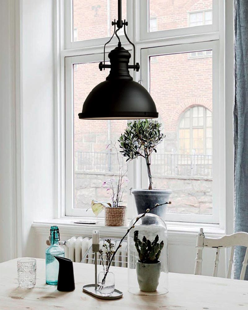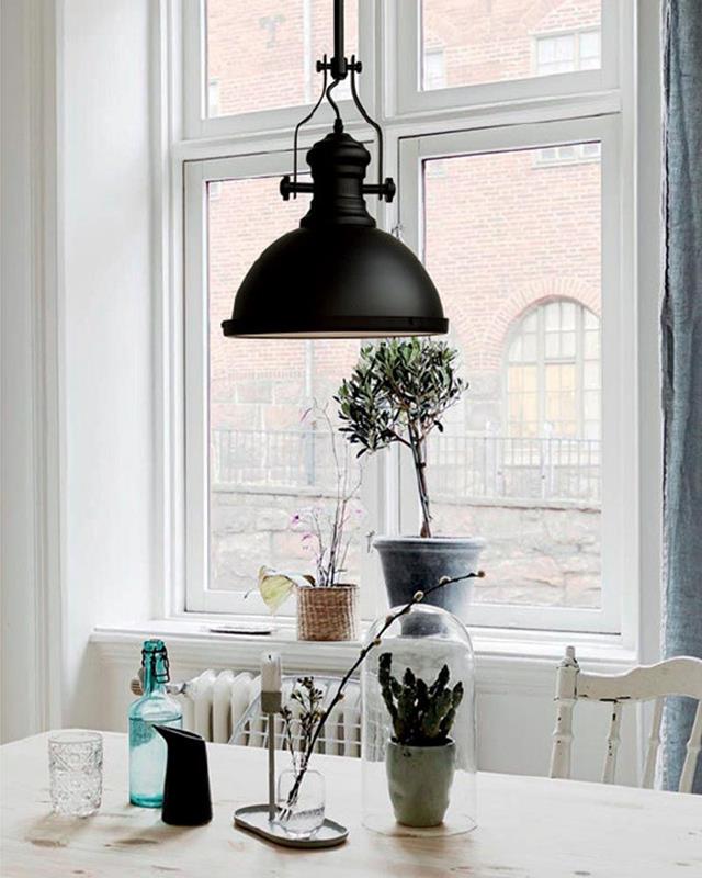 Lámpara de colgar metálica de estilo vintage-industrial en color negro.
