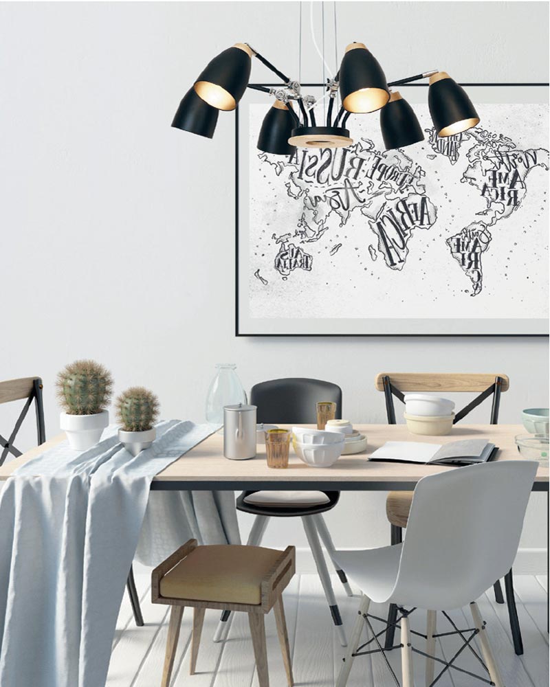 Lámpara de colgar con 6 brazos orientables y detalles en madera.