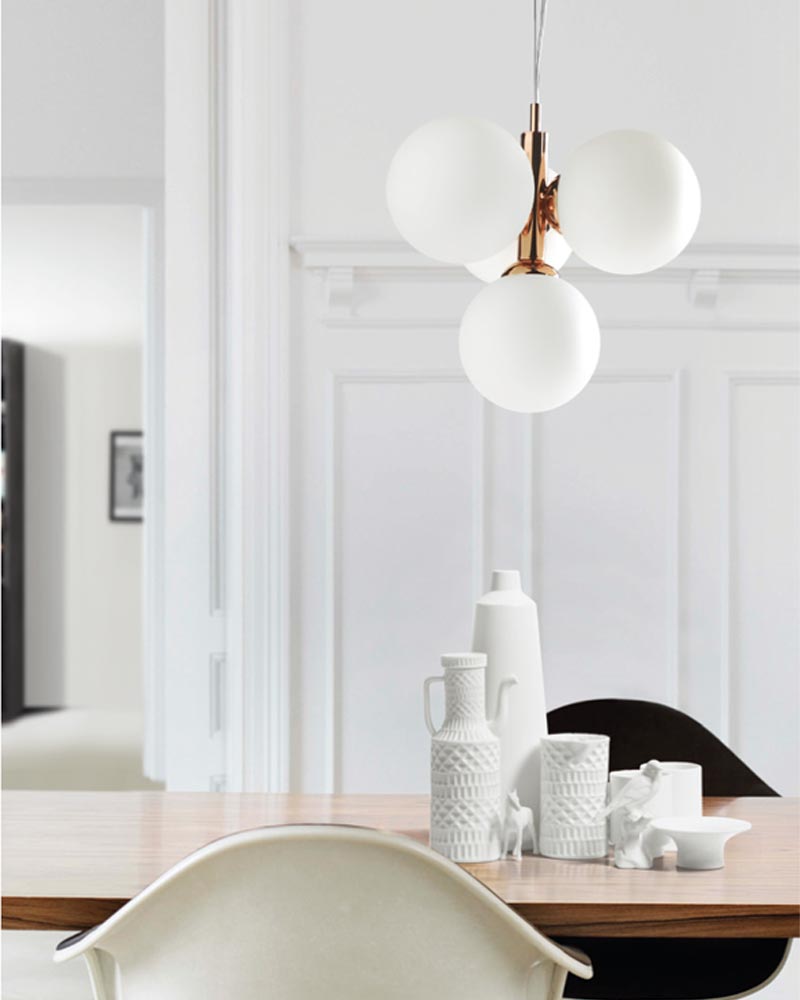 Lámpara de colgar metálica disponible en acabado cromo o cobre con 4 tulipas de cristal opal.