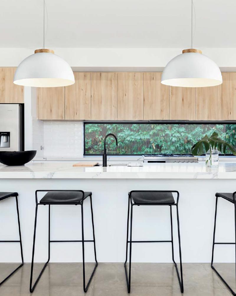 Lámpara de colgar fabricada en metal en color blanco con detalles en madera de fresno natural.