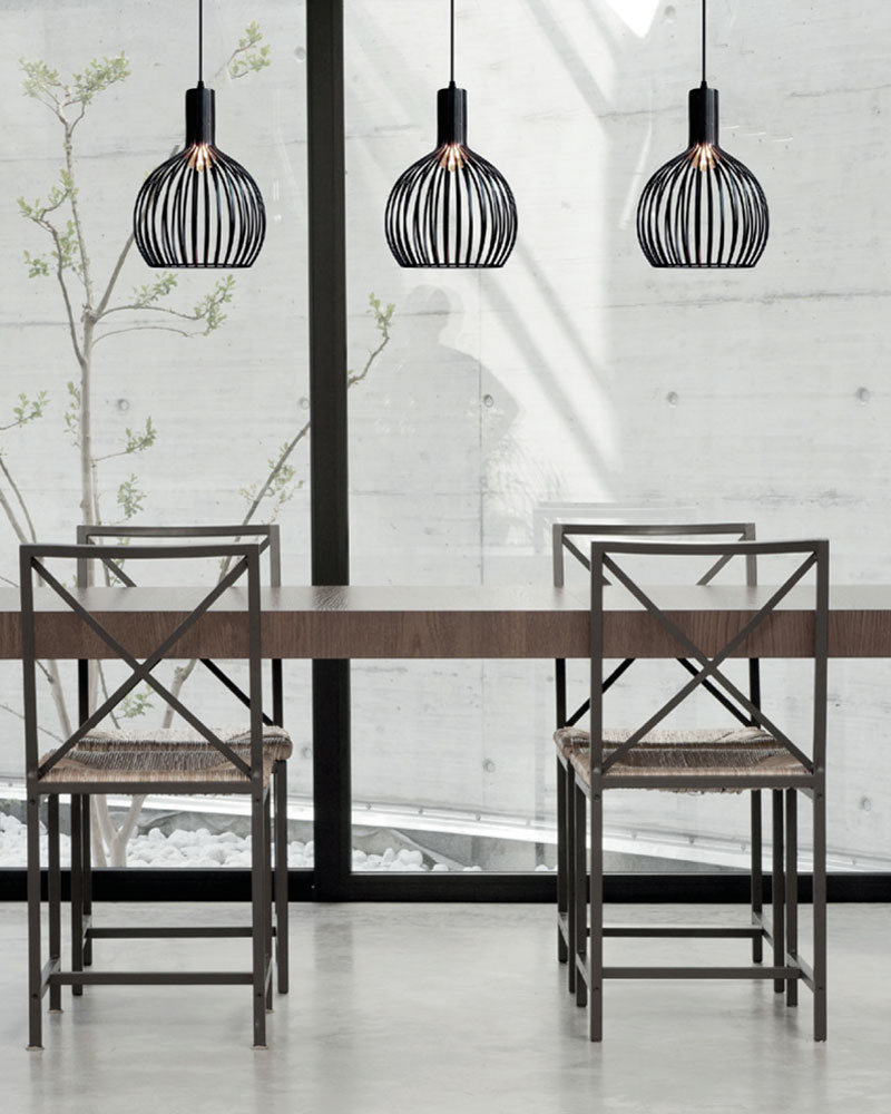 Lámpara de colgar fabricada en metal en acabado negro disponible en 2 tamaños.