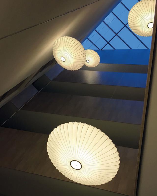 Lámpara de colgar de gran tamaño con pantalla fabricada en polímero de resina con recubrimiento lacado transparente.