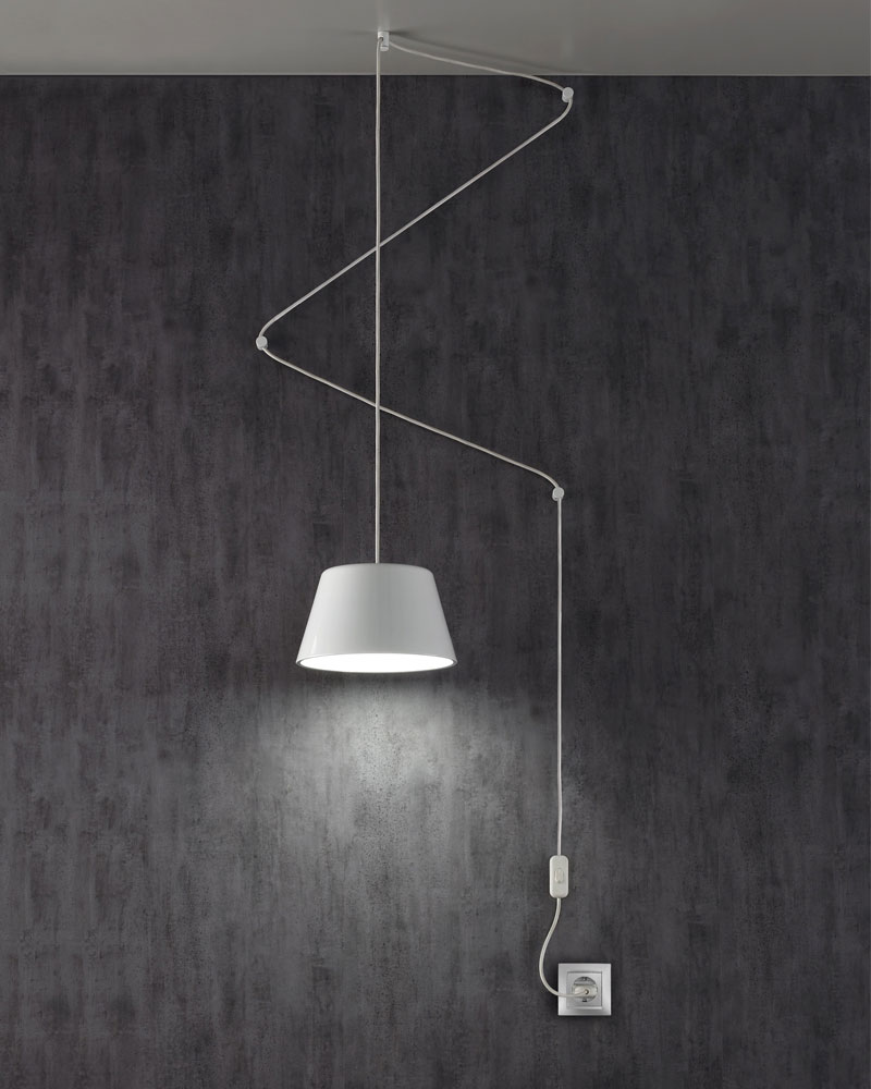 Lámpara de colgar con pantalla metálica en diferentes acabados con difusor acrílico opal blanco. La lámpara está diseñada para poder colgarse sin tener un punto de luz en el techo, ya que viene con enchufe incorporado para poder conectar al enchufe de la pared y guiando el cable con los 4 stoppers incluidos.
