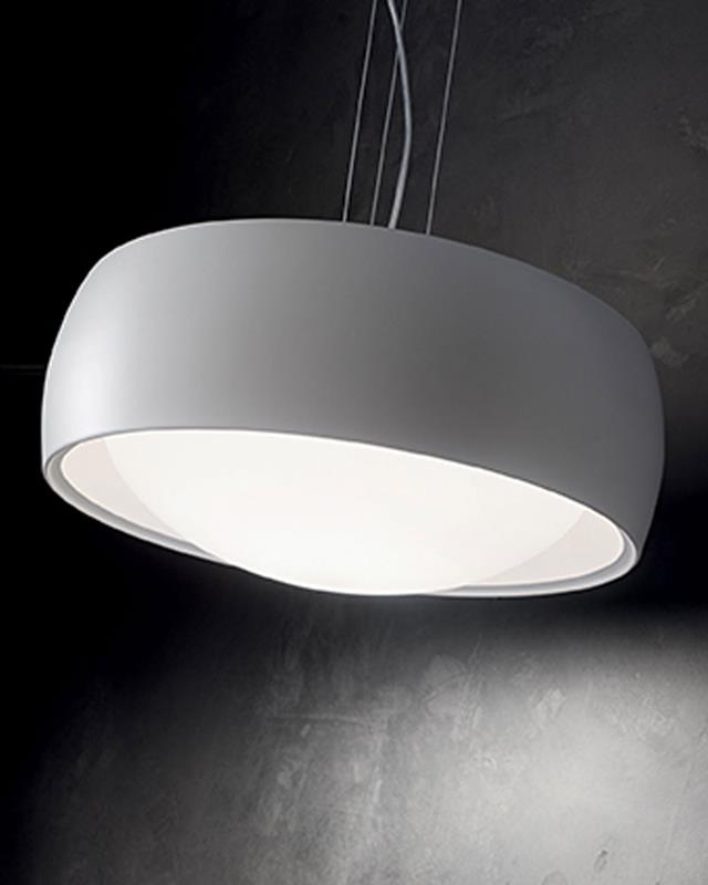 Lámpara de colgar decorativa de diseño italiano fabricada en metal en diferentes acabados con difusor de cristal soplado al ácido blanco.
