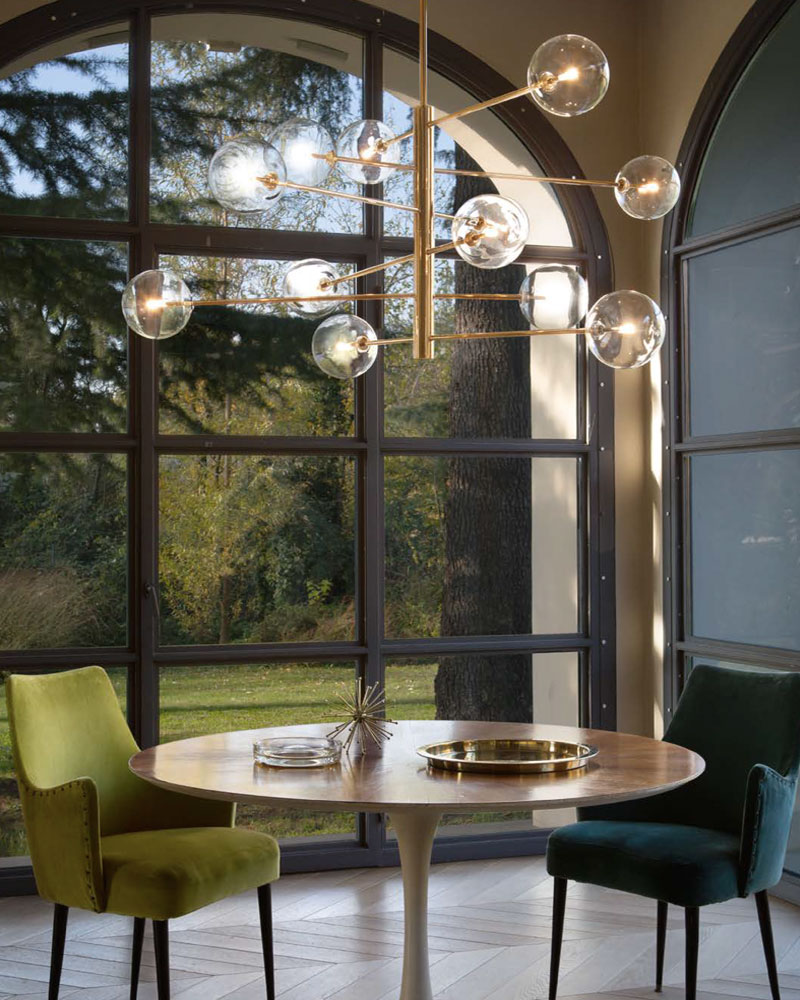 Lámpara de colgar de gran tamaño fabricada en metal disponible en acabado cromo o latón envejecido. La lámpara tiene 12 brazos que se pueden orientar y colocar.