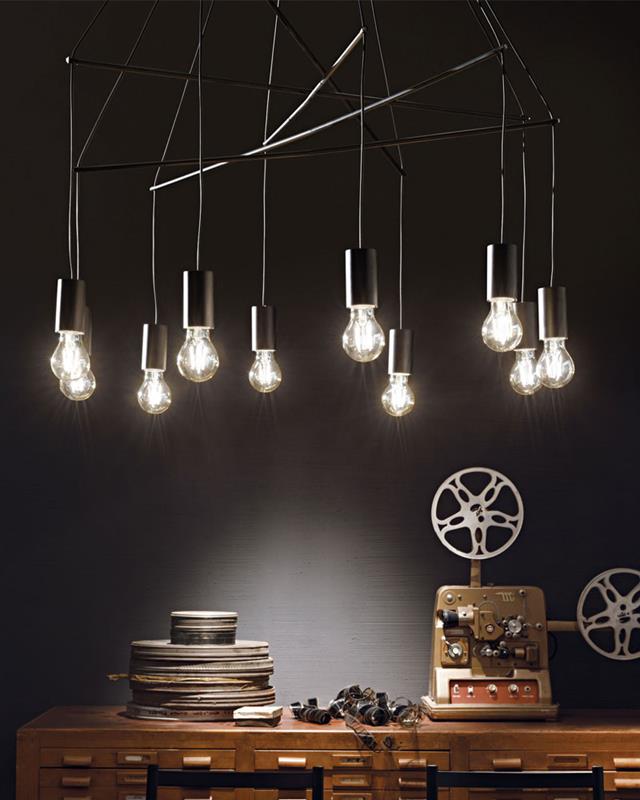 Lámpara de colgar disponible en diferentes versiones y acabados. La lámpara está compuesta de 6 o 10 brazos suspendidos con guías metálicas que componen la forma de los brazos.
