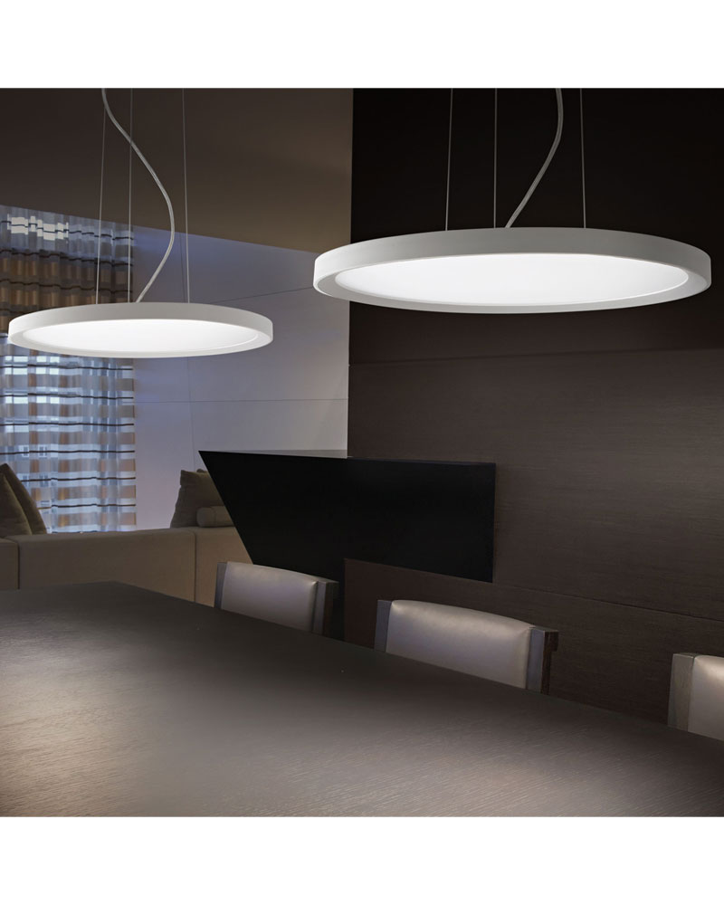 Lámpara de colgar fabricada en metal en acabado blanco satinado con difusor acrílico opal disponible en 2 tamaños.