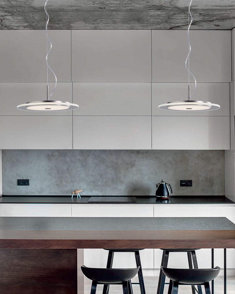 Lámpara de colgar de estilo moderno fabricada en metal acabado níquel mate con difusor circular de cristal.